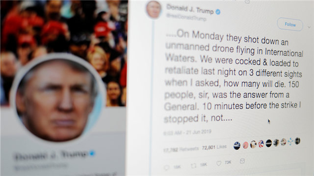 美国总统特朗普6月21日确认,他叫停了一次意在报复伊朗击落美无人机的美军对伊军事行动,并称在对伊问题上“并不着急”。特朗普当天上午在社交媒体推特上发文说,美军20日晚本已准备对伊朗三处目标实施报复性打击,但他在行动开始前10分钟叫停了该行动。特朗普说,他被告知行动或将导致150人死亡,他认为这与伊朗击落美无人机“不对等”。特朗普说,伊朗已经感受到美国制裁带来的“刺痛”,而美国在20日晚也新增了对伊制裁。
