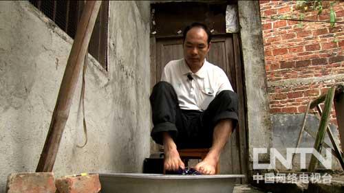 这个正在用双脚洗衣服的人就是李华。三岁失去双臂后,几十年来,常人用手干的活,李华主要用脚干。然而,没有双臂的李华,如今却积累了近千万的家产,是大家眼中的传奇人物。