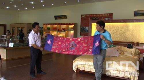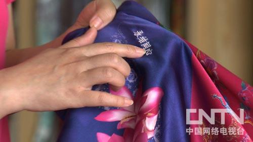 这是张日田新开发的丝绸手包。张日田琢磨,顾客穿了丝绸服装,必然需要搭配手包,这样配套购买,一定能提高销售额。经过产品创新和扩增,现在张日田的丝绸产品达到五百多个品种,也得到了消费者的认可。