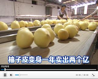 【解说】:吃柚子肯定要先剥掉柚子皮,这是最起码的生活常识,可就是人们吃柚子随手扔掉的柚子皮,却是这家企业赚钱的宝贝,仅仅柚子皮一年就可以创造两个多亿的销售额,他们把柚子皮拿去到底做什么呢?