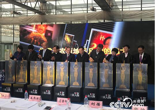 在中国农业科技的殿堂——中国农业科学院科技展示园,国家新闻出版广电总局宣传司司长高长力、农业部人事劳动司巡视员胡永万、中央电视台总编室节目播出部主任史冠翔、中国电视艺术家协会分党组成员副秘书长范宗钗、公安部刑侦局副局长 2014年三农人物陈士渠、中国农业银行企业文化部副总经理刘蓓、十九大代表 中国青年报社长总编辑张坤、十九大代表 2009年三农人物范振喜和主办方中国农业电影电视中心党委书记主任赵泽琨、总编辑傅雪柳,用金水浇筑十座三农人物奖杯,共同开启“中国农业银行杯 CCTV2017年度三农人物推介活动”。
