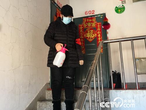 妻子柴翠华为物业小区楼道进行消杀工作