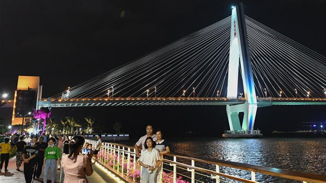 根据文化和旅游部数据中心统计,八天长假,全国共接待国内游客6.37亿人次,实现国内旅游收入4665.6亿元。(图为:10月7日,人们在海口世纪大桥下的海口湾滨海步道上合影留念)