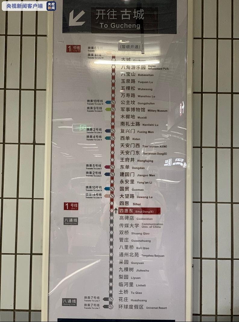 北京地铁1号线与八通线于今天(8月29日)首班车起跨线(贯通)运营,全程时间约为85分钟,现有四惠东站1号线站台和四惠站八通线站台封闭停用,乘客可按照车站标志及工作人员指引有序进出站及乘降列车。