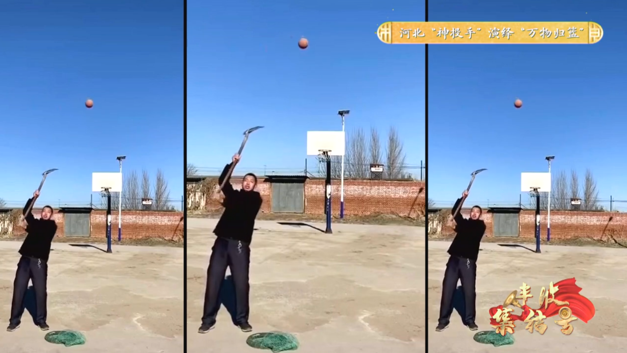 《丰收集结号》的舞台上,来自河北唐山的农民祁春新,手持铁锹、背对高空“移动靶”篮筐,稳稳将球投进,让观众直呼“只可惜CBA赛场不让带铁锹”。祁春新的“神投手”技能,还得追溯到儿时投掷野果林里的果子练出了基本功,后来干农活抛砖上房、斧劈树桩,磨炼出精准投掷技巧,拍视频发到网上获得不少点赞。在网友提议下,他尝试铁锹投篮,没想到轻松投进,从此一发不可收拾,还先后被CBA、村BA邀请到现场表演。 不仅自己练习,祁春新还带动妻子一起锻炼,夫妻搭档健身,不但练出好身体,也练就“神投”绝技,成为网络红人。