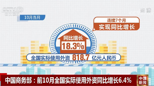 中国商务部:前10月全国实际使用外资同比增长6.4%